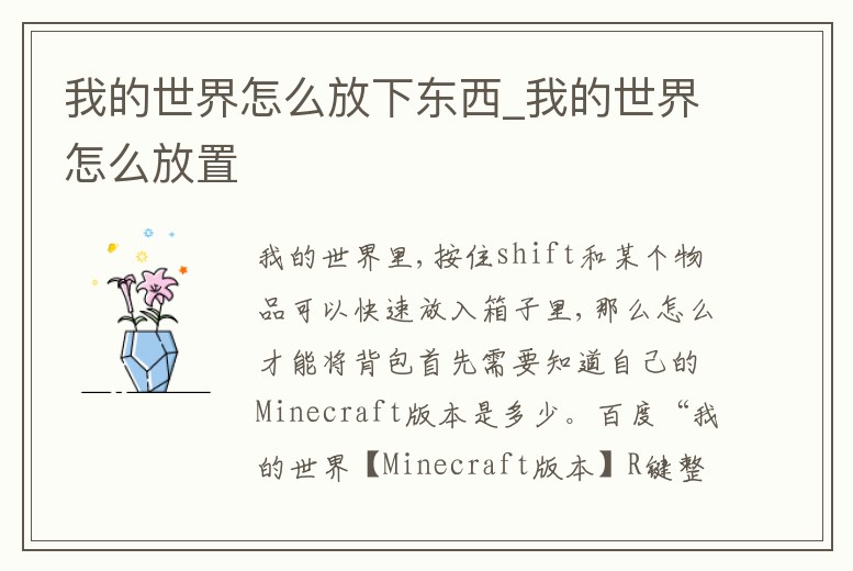 問題一:我的世界怎樣放東西? 電腦嗎?右鍵放,左鍵挖掘。手機是點擊放,長按挖,求采納 問題二:我的世界(電腦版按什么才可以放下物品 放置的按鼠標(biāo)右鍵,丟出去(不要了,但可以撿回來)按Q鍵 問題三:我的世界。