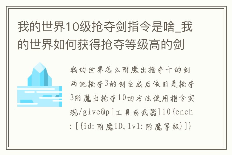 我的世界怎么附魔出搶奪十的劍兩把搶奪3的劍合成后依舊是搶奪3附魔出搶奪10的方法使用指令實現/give@p[工具或武器]10{ench:[{id:附魔ID,lvl:附魔等級}]}(此指令可附到極高極級的附魔等級。最高到32767等)使用修改器使用MOD