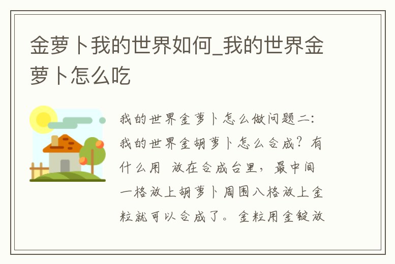 問題二:我的世界金胡蘿卜怎么合成?有什么用 放在合成臺里,最中間一格放上胡蘿卜周圍八格放上金粒就可以合成了。金粒用金錠放在合成臺里就可以獲得了。金胡蘿卜可以引馬,還可以恢復馬的生命值,普通胡蘿卜不可以恢復生。