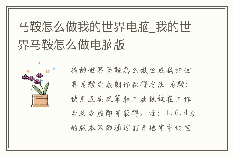 我的世界馬鞍合成制作獲得方法 馬鞍:使用五塊皮革和三塊鐵錠在工作臺處合成即可獲得。注:1.6.4后的版本只能通過打開地牢中的寶箱獲得馬鞍。馬鎧甲:使用七張皮革在工作臺處合成即可獲得一套皮質馬鎧,另外可通過花。