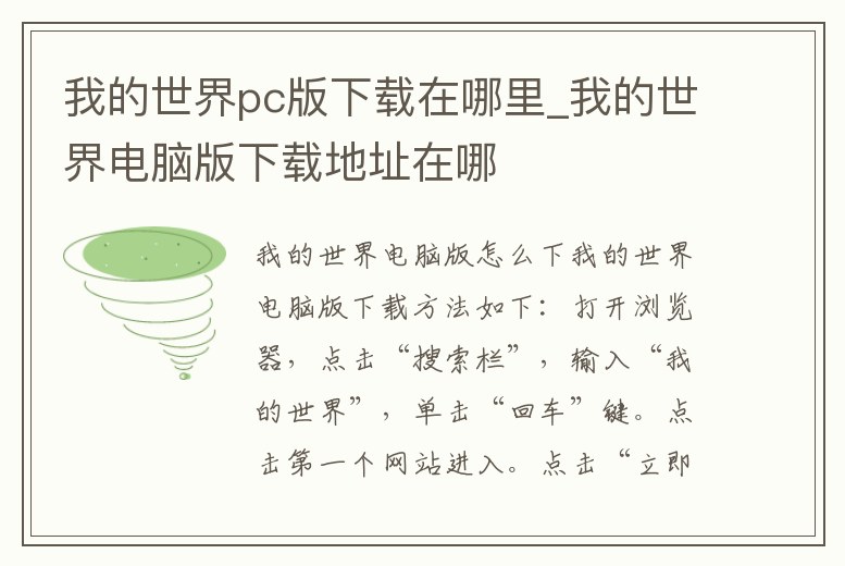 我的世界電腦版怎么下我的世界電腦版下載方法如下:打開瀏覽器,點擊“搜索欄”,輸入“我的世界”,單擊“回車”鍵。點擊第一個網(wǎng)站進入。點擊“立即下載端游”,下方彈出的窗口點擊“保存”。等待下載完成后,點擊“運行”,勾。2、我的世界在哪可以下載電腦版可以在我的世界官網(wǎng)下