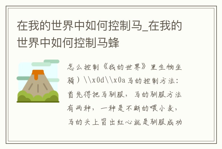 怎么控制《我的世界》里生物坐騎)\x0d\x0a馬的控制方法:首先得把馬馴服,馬的馴服方法有兩種,一種是不斷的喂小麥,馬的頭上冒出紅心就是馴服成功。另外一種就是空手不斷的右鍵馬背,玩家就會騎上馬上,不過這個時候馬會把玩家甩落,當騎上馬,馬。2、我的世界如何馴服馬《我的世界》里面,準備好食物,用食物喂馬,就可以馴服馬了。