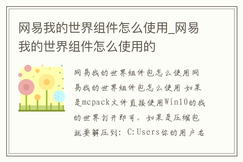 網(wǎng)易我的世界組件包怎么使用 如果是mcpack文件直接使用Win10的我的世界打開即可。如果是壓縮包就要解壓到:C:Users你的用戶名appdataLocalPackagesMicrosoft.MinecraftUWP_8wekyb3d8bbweLocalStategamescom.mojangresource_p。