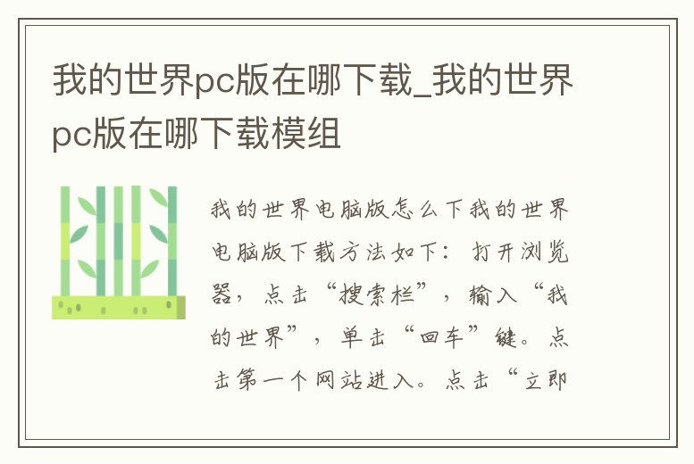 我的世界電腦版怎么下我的世界電腦版下載方法如下:打開瀏覽器,點擊“搜索欄”,輸入“我的世界”,單擊“回車”鍵。點擊第一個網站進入。點擊“立即下載端游”,下方彈出的窗口點擊“保存”。等待下載完成后,點擊“運行”,勾