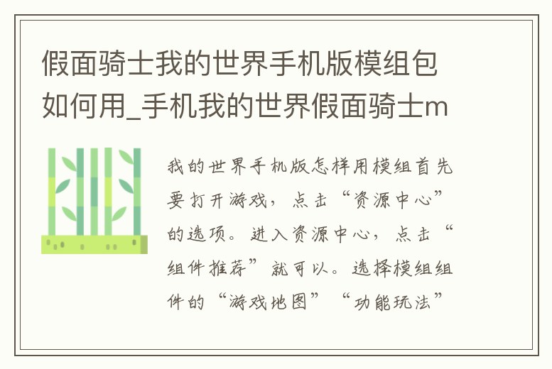 我的世界手機版怎樣用模組首先要打開游戲,點擊“資源中心”的選項。進入資源中心,點擊“組件推薦”就可以。選擇模組組件的“游戲地圖”“功能玩法”“材質(zhì)光影”“皮膚”這些選項,來選擇相關(guān)模組,這里需要選擇“游戲地圖”。進入游戲地。2、我的世界手機版下載了模組怎么使用我的世界下