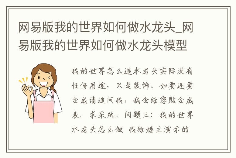 實際沒有任何用途,只是裝飾。如要還要合成請追問我,我會給您貼合成表。求采納。問題三:我的世界水龍頭怎么做 我給樓主演示的是多數的水龍頭用法,因為沒有家具mod所以就暫時只能這么演示,在泥土塊上放上水龍頭之后。