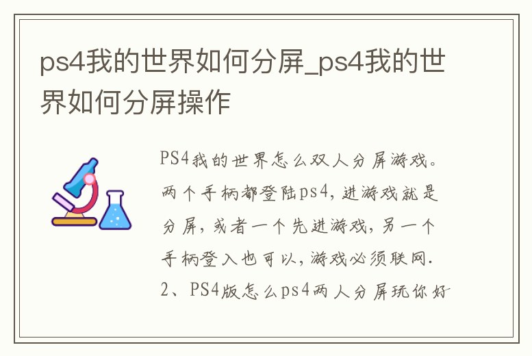 PS4我的世界怎么雙人分屏游戲。兩個手柄都登陸ps4,進游戲就是分屏,或者一個先進游戲,另一個手柄登入也可以,游戲必須聯網.2、PS4版怎么ps4兩人分屏玩你好,ps4游戲要分屏雙人玩的話,必須這個游戲支持分屏的,如果支持的話,直接進入游戲,在進入游戲的時候,選擇雙人,或進入游戲后打開2P就可