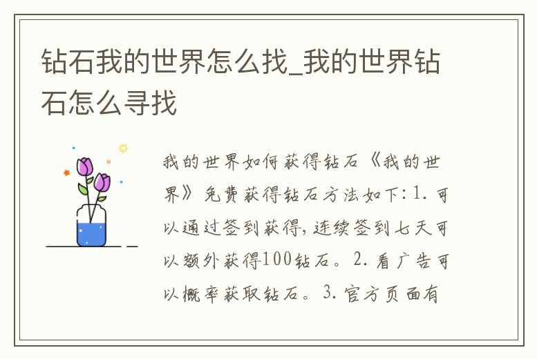 《我的世界》免費獲得鉆石方法如下:1.可以通過簽到獲得,連續簽到七天可以額外獲得100鉆石。2.看廣告可以概率獲取鉆石。3.官方頁面有許多活動也可以白嫖到鉆石。《我的世界》鉆石的作用:制作工具裝備:鉆石最大的作用就是。