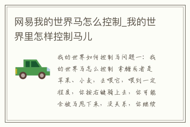 問題一:我的世界馬怎么控制 拿糖或者是蘋果、小麥,去喂它,喂到一定程度,你按右鍵騎上去,你可能會被馬甩下來,沒關系,你繼續騎上去,直到在馬周圍有愛心出現,你就馴服它了,然后你在給馬裝上鞍(記得是騎在馬身。