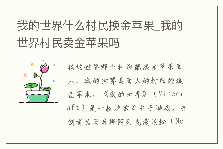 商人。我的世界是商人的村民能換金蘋果。《我的世界》(Minecraft)是一款沙盒類電子游戲,開創者為馬庫斯阿列克謝泊松(Notch)。