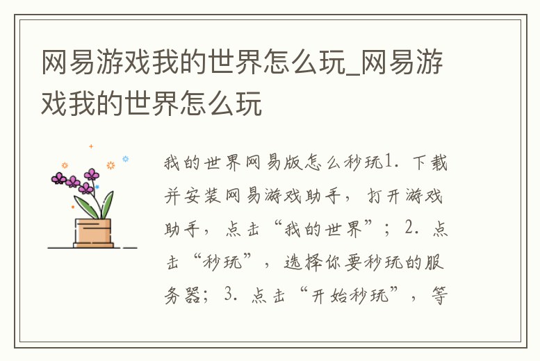 1. 下載并安裝網易游戲助手,打開游戲助手,點擊“我的世界”;2. 點擊“秒玩”,選擇你要秒玩的服務器;3. 點擊“開始秒玩”,等待游戲加載完成;4. 登錄游戲,輸入你的賬號和密碼,點擊“登錄”;5. 登錄成功后,點。