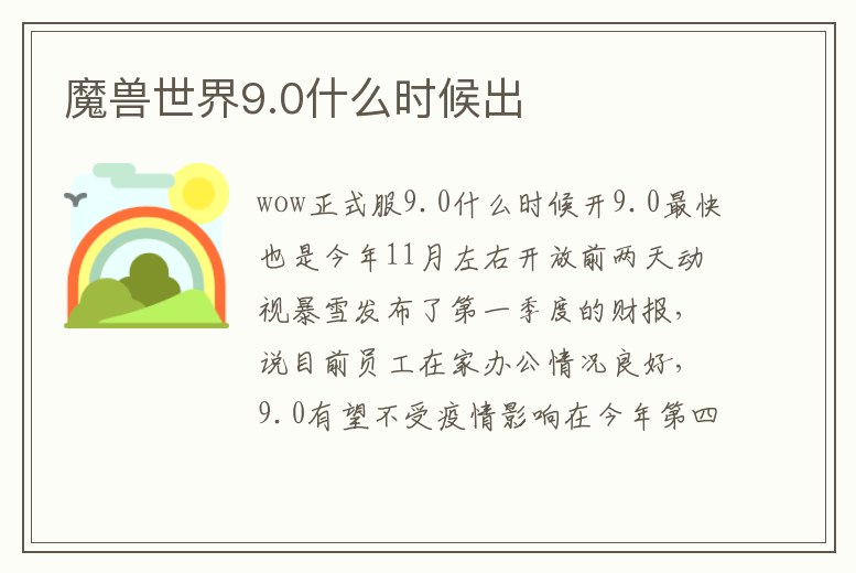 wow正式服9.0什么時候開9.0最快也是今年11月左右開放前兩天動視暴雪發(fā)布了第一季度的財報,說目前員工在家辦公情況良好,9.0有望不受疫情影響在今年第四季度開放。1、魔獸世界9.0團本什么時候開放在魔獸世界9.0版本中團本的開放時間是2020年12月10日,也就是說距離團本開放已經(jīng)沒有多少天了,這個時候很多肝帝玩家的主線以