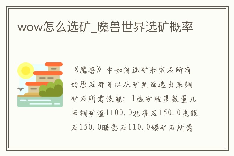 登錄魔獸世界 1:打開人物技能欄 2:選擇專業技能 3:在采礦欄右側即可發現選礦標識 4:右鍵點擊選礦標識然后放在所想要選擇的礦石上面,即可完成選礦 。