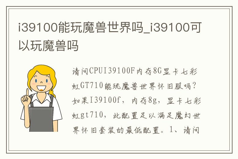 請問CPUI39100F內存8G顯卡七彩虹GT710能玩魔獸世界懷舊服嗎?如果I39100f,內存8g,顯卡七彩虹gt710,此配置足以滿足魔幻世界懷舊套裝的最低配置。1、請問CPUI39100F內存8G顯卡七彩虹GT710能玩魔獸世界懷舊服嗎?如果I39100F,內存8G,顯卡七彩虹GT710,這個配置足夠滿足魔獸世界懷舊服的最低配置的。2、英特爾i39100f四核配顯卡580玩魔