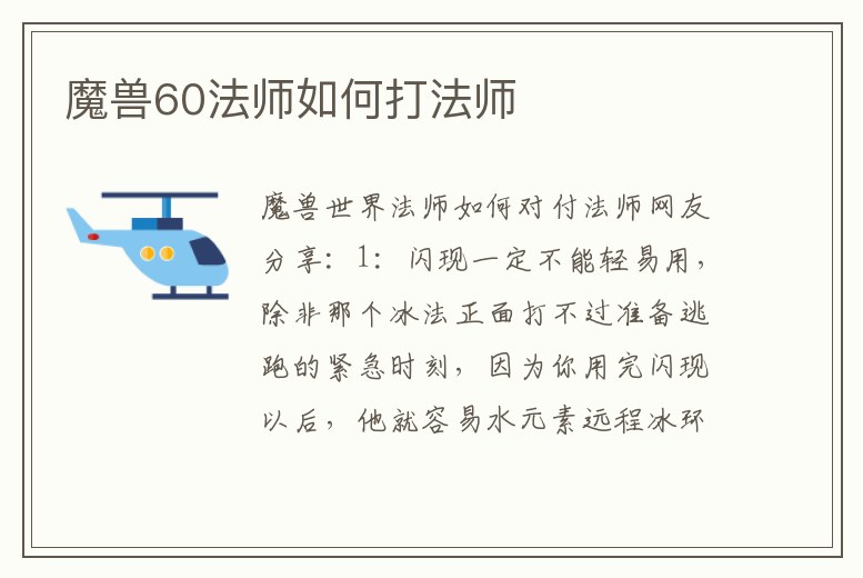 魔獸世界法師如何對付法師網(wǎng)友分享:1:閃現(xiàn)一定不能輕易用,除非那個冰法正面打不過準備逃跑的緊急時刻,因為你用完閃現(xiàn)以后,他就容易水元素遠程冰環(huán),或者直接靠近你冰環(huán)你,無限冰槍,然后放冰法大招(凍在原地)暴你,傷害也是十分可觀的2奧術彈幕點完也。1、【魔獸世界】60級滿級的時候法師練級用什么天賦比較打怪快團本天賦(