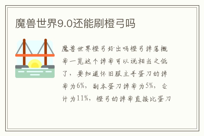 魔獸世界橙弓好出嗎橙弓掉落概率一覽這個(gè)掉率可以說(shuō)相當(dāng)之低了,要知道懷舊服主手蛋刀的掉率為6%,副本蛋刀掉率為5%,合計(jì)為11%,橙弓的掉率直接比蛋刀還要低不少。同樣掉率偏低的還有納魯薄片,這件裝備并不是必掉的,從測(cè)試