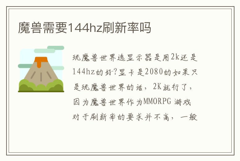 如果只是玩魔獸世界的話,2K就行了,因為魔獸世界作為MMORPG 游戲 對于刷新率的要求并不高,一般顯示器60HZ的就足夠了,144刷新率主要是作為競技顯示器的標配使用,適合吃雞、DOTA2這類電競 游戲 使用,特別是是FPS的 游戲 。