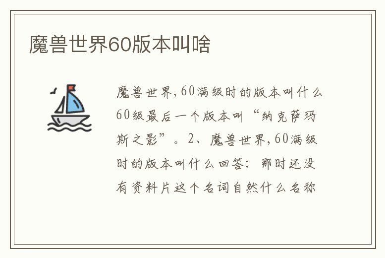 魔獸世界,60滿級時(shí)的版本叫什么60級最后一個(gè)版本叫“納克薩瑪斯之影”。2、魔獸世界,60滿級時(shí)的版本叫什么回答:那時(shí)還沒有資料片這個(gè)名詞自然什么名稱都沒有現(xiàn)在都是叫經(jīng)典舊世的。3、魔獸世界60級的版本叫什么《魔獸世界1.