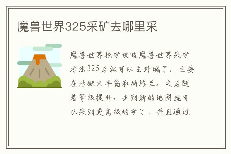 魔獸世界挖礦攻略魔獸世界采礦方法325后就可以去外域了。主要在地獄火半島和納格蘭。之后隨著等級提升,去到新的地圖就可以采到更高級的礦了。并且通過飛行坐騎,你的效率還可以大量提升。1、WOW采礦每個級別段都應該去哪采\x0d\x0a\x0d\x0aBL:開始到森金村和剃刀嶺附近挖銅礦,之后可以到千針附近去挖