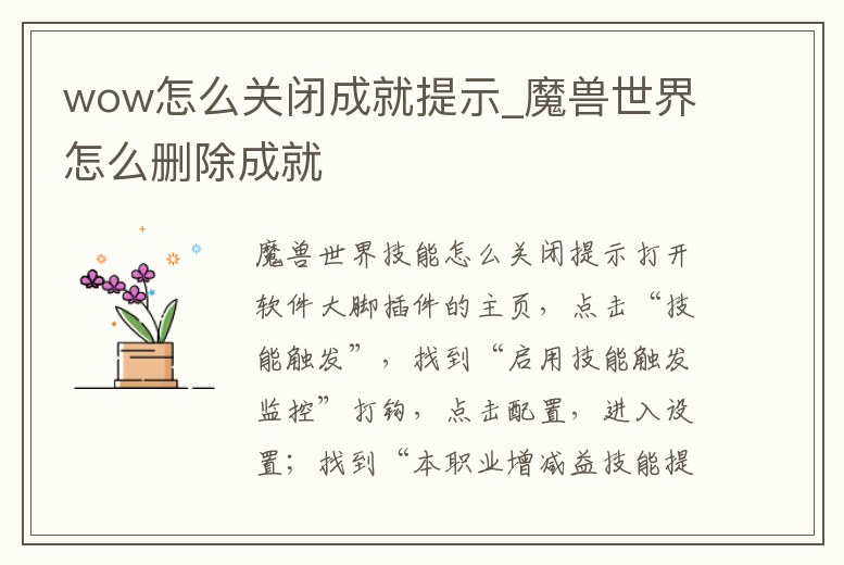 魔獸世界技能怎么關閉提示打開軟件大腳插件的主頁,點擊“技能觸發”,找到“啟用技能觸發監控”打鉤,點擊配置,進入設置;找到“本職業增減益技能提示”,將想要提示的技能ID寫在“技能法術ID”框里,點擊“增加”,即可在右側顯示技能中顯示。1、魔獸世界怎么關閉成就在公會的顯示。如果說想要不引起