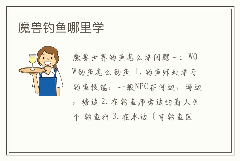 問題一:WOW釣魚怎么釣魚 1.釣魚師處學習釣魚技能,一般NPC在河邊,海邊,塘邊 2.在釣魚師旁邊的商人買個 釣魚桿 3.在水邊(可釣魚區域)裝備上釣魚桿,點 釣魚 那個圖標,如果不清楚這個圖標,要點擊 技能與法術 這個。
