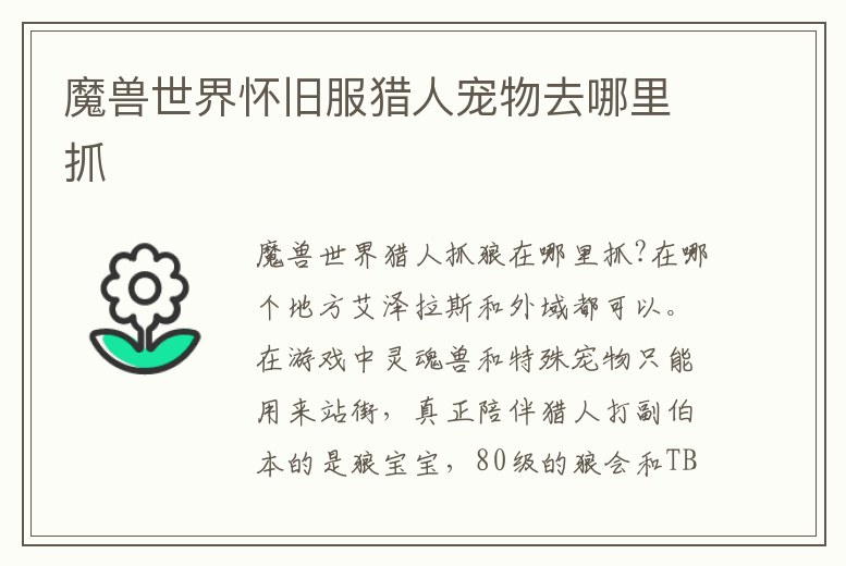 艾澤拉斯和外域都可以。在游戲中靈魂獸和特殊寵物只能用來站街,真正陪伴獵人打副伯本的是狼寶寶,80級的狼會和TBC版本的掠食者一樣,陪伴獵人度過整個WLK版本。現階段獵人就度可以抓捕狼寶寶,艾澤拉斯和外域有許多狼,之類建議。