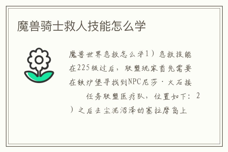 1)急救技能在225級過后,聯盟玩家首先需要在鐵爐堡尋找到NPC尼莎·火石接取任務聯盟醫療隊,位置如下:2)之后去塵泥沼澤的塞拉摩島上尋找NPC古斯塔夫·范沃森醫生開啟后續任務救死扶傷,做完任務,就可以學習大師級急救了,位置。