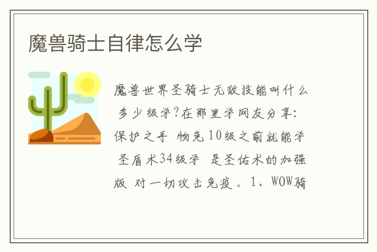 需要等級70 瞬發(fā) 3分鐘冷卻時(shí)間 使你造成的所有傷害提高30%,持續(xù)20秒。使用此技能會引發(fā)自律效果。★★★絕對觸發(fā)自律★★★,我就是騎士!自律是種DEBUFF,就是在自律時(shí)間里不能使用那幾個無敵技能(專指騎士)。