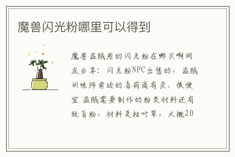 網友分享:閃光粉NPC出售的,盜賊訓練師旁邊的毒藥商有賣。很便宜 盜賊需要制作的粉類材料還有致盲粉,材料是枯葉草,大概20-30級怪的地圖上能挖到 盜賊是個賺錢機器 練雙采集不錯 也就是采礦和采藥 賺錢的首選 。