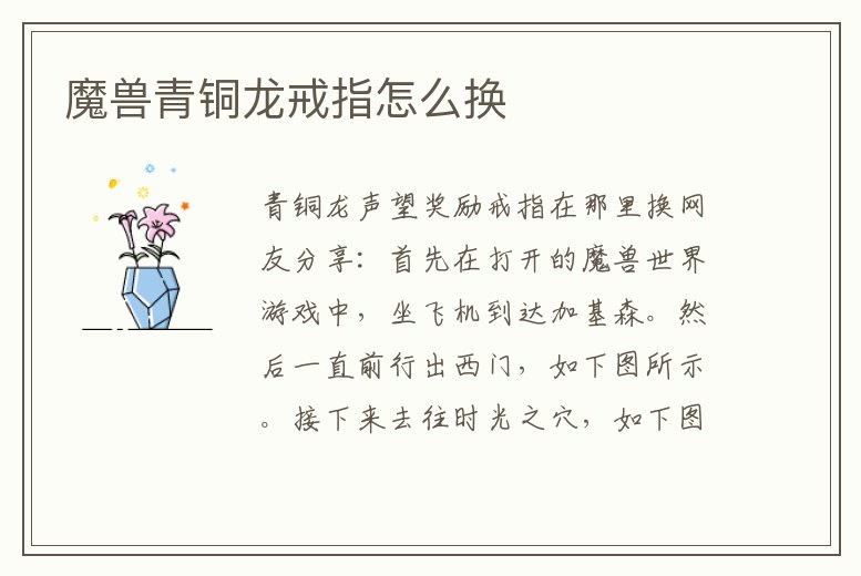 網友分享:首先在打開的魔獸世界游戲中,坐飛機到達加基森。然后一直前行出西門,如下圖所示。接下來去往時光之穴,如下圖所示。到達時光之穴后,進入深處,如下圖所示。最后點擊巨龍,然后兌換戒指即可,如下圖所示。