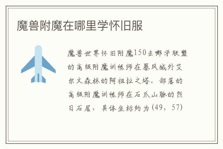 懷舊服附魔280以后去北極的登陸點或者達拉然都可以學;當然沙塔斯也可以學,占星者高地或者奧爾多高地都可以。