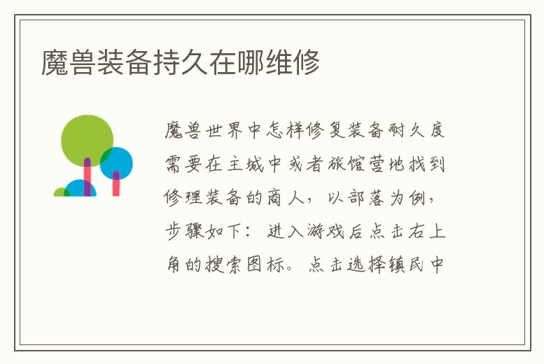 需要在主城中或者旅館營地找到修理裝備的商人?!赌ЙF世界》(World of Warcraft)是由著名游戲公司暴雪娛樂所制作的第一款網絡游戲,屬于大型多人在線角色扮演游戲。游戲以該公司出品的即時戰略游戲《魔獸爭霸》的劇情為歷史背景。