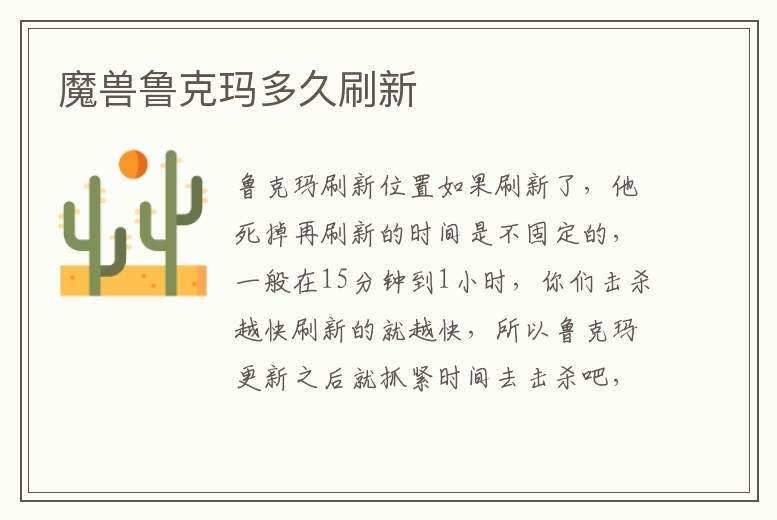 每周一個(gè)服務(wù)器只刷新一個(gè)世界boss。如果你們服沒(méi)有刷新魯克瑪而是其他boss,那么這周就不會(huì)刷了。如果刷新了,他死掉再刷新的時(shí)間是不固定的,一般在15分鐘到1小時(shí),你們擊殺越快刷新的就越快。