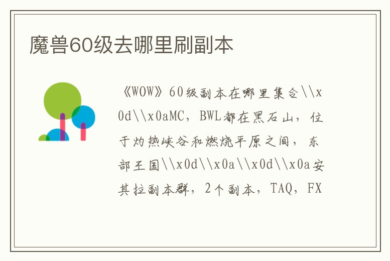 《WOW》60級副本在哪里集合\x0d\x0aMC,BWL都在黑石山,位于灼熱峽谷和燃燒平原之間,東部王國\x0d\x0a\x0d\x0a安其拉副本群,2個副本,TAQ,FX在甲蟲之墻后面,位于希利蘇斯,卡利姆多大陸\x0d\x0a黑石山副本群,5個副本,入口都在黑。2、魔獸世界60年代法師能單刷哪些副本1.瑪拉頓在