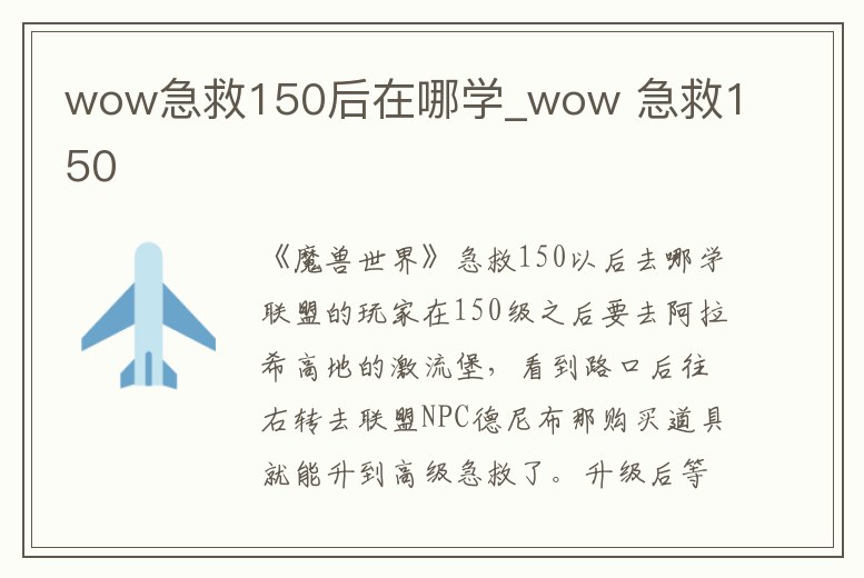 《魔獸世界》急救150以后去哪學聯盟的玩家在150級之后要去阿拉希高地的激流堡,看到路口后往右轉去聯盟NPC德尼布那購買道具就能升到高級急救了。升級后等級上限到225級,NPC在過了橋之后的右邊可以看見,順便還可以買魔紋繃帶和絲綢繃帶的配方。和聯盟不一。1、魔獸世界急救烹飪釣魚150以后分別去哪學聯盟玩家:烹飪等級到了150級后可以到灰谷的石爪小徑附近找到npc珊蒂瑞亞(49,67)購買中級烹飪教