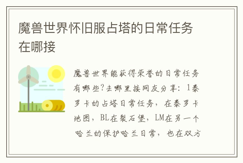 網友分享:1泰羅卡的占塔日常任務,在泰羅卡地圖,BL在裂石堡,LM在另一個 哈蘭的保護哈蘭日常,也在雙方營地,聲望軍需官旁邊接 還有戰場日常,在排戰場的NPC旁邊接 建議做占塔不做哈蘭的,占塔簡單,六小時一次 2大鳥是你學了最。