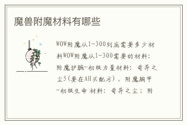 WOW附魔從1-300需要的材料:附魔護腕-初級力量材料:奇異之塵5(要在AH買配方) 。附魔胸甲-初級生命 材料:奇異之塵 ;附魔護腕-初級耐力材料:奇異之塵(3) 。薩格拉斯之墓再度開啟,燃燒軍團的惡魔涌入我們的世界。他們那。