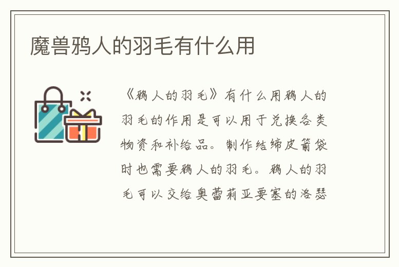 鴉人的羽毛可以交給奧蕾莉亞要塞的洛瑟蕾絲、裂石堡的瑪魯卡茲和沙塔斯城貧民窟的維卡克斯。玩家將鴉人的羽毛交給洛瑟蕾絲或瑪魯卡茲時,可以獲得鴉人獵手的補給品,交給維卡克斯時,可以獲得流放者的物資。《魔獸世界》游戲簡介 《。