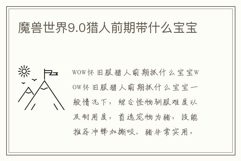 wow懷舊服獵人前期抓什么寶寶wow懷舊服獵人前期抓什么寶寶一般情況下,綜合怪物馴服難度以及耐用度,首選寵物為豬,技能推薦沖鋒加撕咬。豬非常實用,仇恨很穩,傷害效率也不低,比較好培養。如果玩家喜歡鳥類,那么建議抓一只貓頭鷹,技能可以選擇俯沖。1、魔獸世界獵人帶什么寶寶獵人必帶寶寶推薦在魔獸世界中,獵人必帶寶寶
