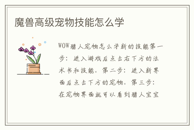 被動技能:增強耐力,自然護甲,傷害抵抗(奧、火、冰、自然、暗),等均可在NPC處學習。要學習npc的技能只要主人打到所要求的等級然后給錢就行,各大主城都有寵物技能npc。以上就是懷舊服獵人寵物技能學習方法。