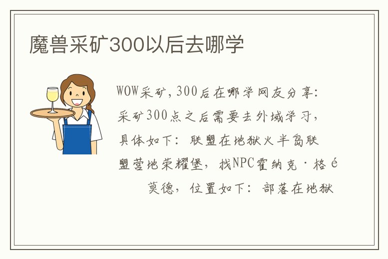 網友分享:采礦300點之后需要去外域學習,具體如下:聯盟在地獄火半島聯盟營地榮耀堡,找NPC霍納克·格里莫德,位置如下:部落在地獄火半島部落營地薩爾瑪,找NPC克魯格什,位置如下:。