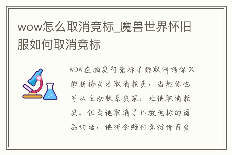 wow在拍賣行競標了能取消嗎你只能祈禱賣方取消拍賣,當然你也可以主動聯系賣家,讓他取消拍賣。但是他取消了已被競標的商品的話,他將會賠付競標價百分之10的金幣給系統。1、在拍賣行里競標了以后,怎么取消競標啊競標了是無法取消的~~除非別人再去競標。那樣你的G就退回來了。2、wow怎么取消競拍網友分享:如果是你賣的東西,那就跑到拍賣行