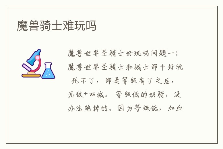 問題一:魔獸世界圣騎士和戰(zhàn)士那個(gè)好玩 死不了,那是等級(jí)高了之后,無敵+回城。 等級(jí)低的奶騎,沒辦法跑掉的。因?yàn)榈燃?jí)低,加血技能也少。戰(zhàn)士和圣騎士各有各的好玩,戰(zhàn)士傷害比騎士高。圣騎士的話,這個(gè)版本要有橙色披。
