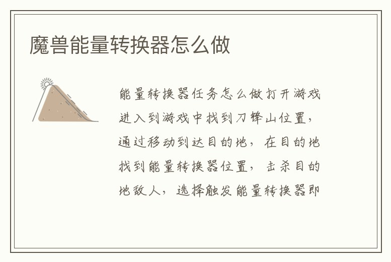 打開游戲進入到游戲中找到刀鋒山位置,通過移動到達目的地,在目的地找到能量轉換器位置,擊殺目的地敵人,選擇觸發能量轉換器即可完成任務。魔獸世界:魔獸世界(World of Warcraft)是由著名游戲公司暴雪娛樂所制作的第一款網絡。