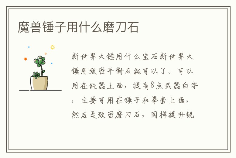 新世界大錘用致密平衡石就可以了。可以用在鈍器上面,提高8點武器白字,主要可用在錘子和拳套上面,然后是致密磨刀石,同樣提升銳器8點傷害,用在刀劍匕首上面。其它種類的磨刀石和平衡石我們不考慮,因為只有這兩種是直接加傷。