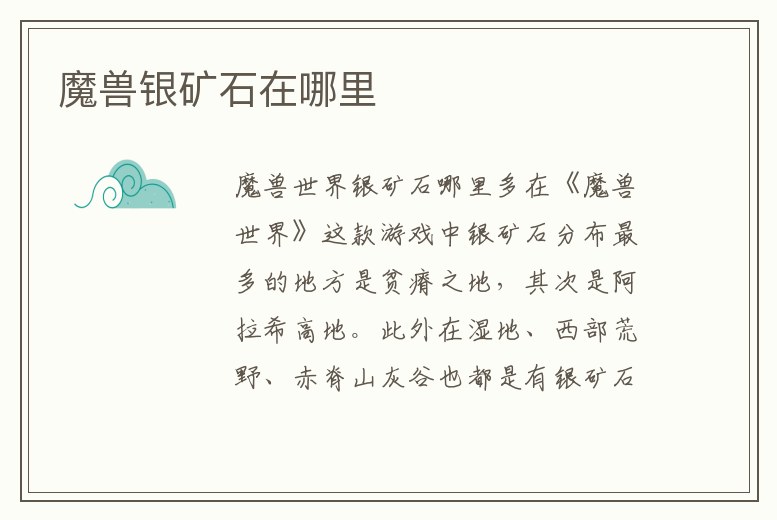 在《魔獸世界》這款游戲中銀礦石分布最多的地方是貧瘠之地,其次是阿拉希高地。此外在濕地、西部荒野、赤脊山灰谷也都是有銀礦石分布的。《魔獸世界》游戲里面的很多地圖里面都分布著很多銀礦,玩家可以通過采礦技能來搜索銀礦。