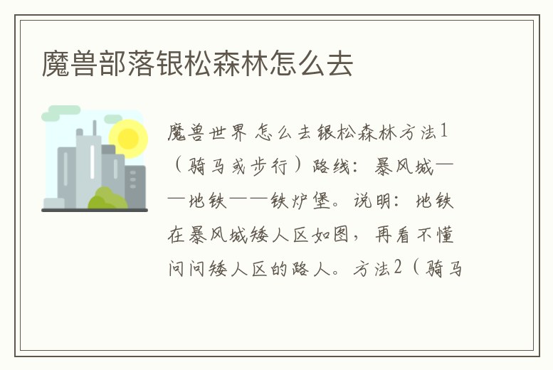 問題一:魔獸世界聯盟怎么去銀松森林 要去那里應該就是要去刷YY或者XS吧。首先要到濕地(暗夜,DLN在黑海岸坐船;其他的就從鐵爐堡跑過去),然后去ALX高地,再是丘陵,順便把南海飛機點開了(如果開了可以直接飛)。YY就。