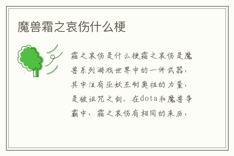 霜之哀傷是魔獸系列游戲世界中的一件武器,其中注有巫妖王耐奧祖的力量,是被詛咒之劍。在dota和魔獸爭霸中,霜之哀傷有相同的來歷,但是其屬性不一樣。D&D的模版中的霜之哀傷是一件被惡魔鍛造擁有巫妖王力量的強大的邪惡神器。