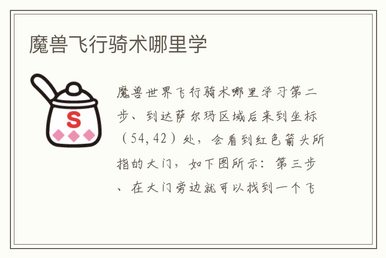 第二步、到達薩爾瑪區域后來到坐標(54,42)處,會看到紅色箭頭所指的大門,如下圖所示:第三步、在大門旁邊就可以找到一個飛行訓練師,如下圖所示:第四步、最后就可以在這里學習飛行騎術了,如下圖所示:。