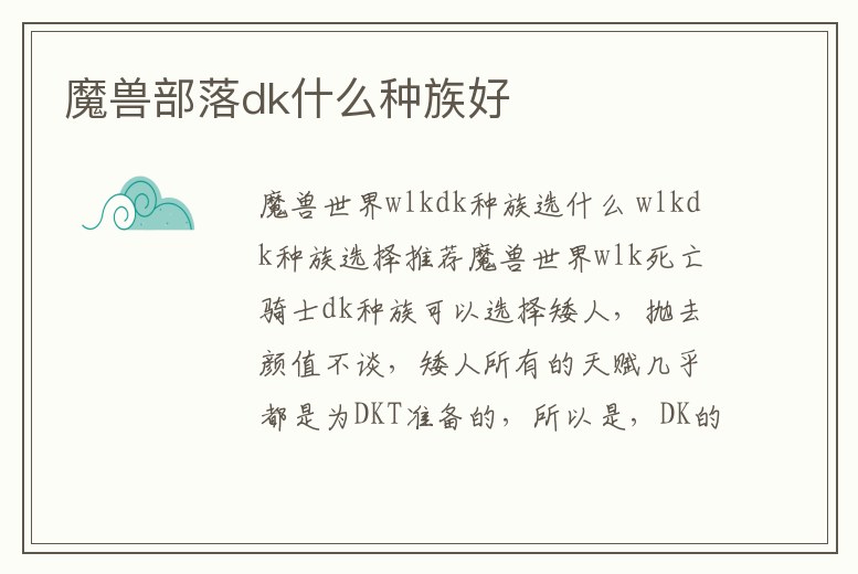 魔獸世界wlk死亡騎士dk種族可以選擇矮人,拋去顏值不談,矮人所有的天賦幾乎都是為DKT準備的,所以是,DK的種族最優解,注重外觀的話可以選人類,血精靈或者亡靈。1.雙手錘精準,矮人擁有全種族最搞的精準,+10,人類是劍錘。